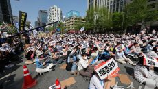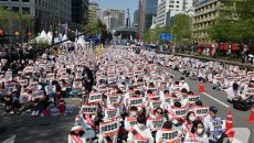 (서울=뉴스1) 허경 기자 = 20일 서울 중구 숭례문 일대에서 열린 '의료정상화를 위한 전국의사궐기대회'에서 참석자들이 구호- 2025-04-20 14:50