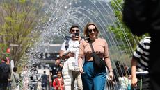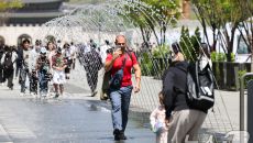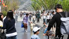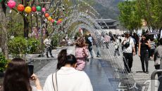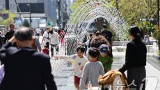 (서울=뉴스1) 허경 기자 = 봄철 마지막 절기 곡우(穀雨)인 20일 서울 광화문광장에서 시민과 관광객들이 분수터널을 지나고- 2025-04-20 13:15