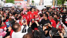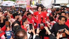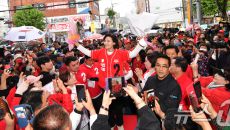 (포항=뉴스1) 최창호 기자 = 김문수 국민의힘 대통령 후보 배우자 설난영 여사가 24일 경북 포항시 죽도시장 입구에서 지지자- 2025-05-24 18:25