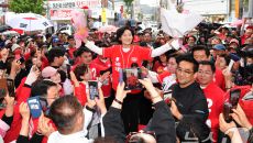 (포항=뉴스1) 최창호 기자 = 김문수 국민의힘 대통령 후보 배우자 설난영 여사가 24일 경북 포항시 죽도시장 입구에서 지지자- 2025-05-24 18:26