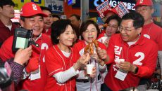 (포항=뉴스1) 최창호 기자 = 김문수 국민의힘 대통령 후보 배우자 설난영 여사가 24일 오후 경북 포항시 죽도시장 입구에서- 2025-05-24 18:26