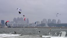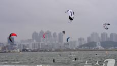 (포항=뉴스1) 최창호 기자 = 24일 오후 경북 포항시 송도해수욕장에서 카이트보드 동호인들이 바람을 가르며 수면 위를 질주하- 2025-05-24 14:15