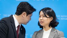귀엣말 나누는 진종오 의원과 손주하 구의원