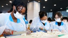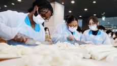 가래떡 썰기 도전하는 외국인 유학생