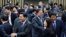 [서울=뉴스핌] 윤창빈 기자 = 더불어민주당 의원들이 4일 오후 서울 여의도 국회에서 열린 비상의원총회에서 윤석열 파면을 축하- 2025-04-04 14:59