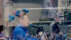 방탄유리 사이에서 지지 호소하는 이재명 후보