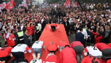 [서울=뉴스핌] 최지환 기자 = 김문수 국민의힘 대선후보가 19일 서울역 광장 유세에서 지지자들을 향해 큰 절을 하고 있다.- 2025-05-19 19:52