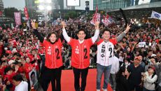 [서울=뉴스핌] 최지환 기자 = 김문수 국민의힘 대선후보가 19일 서울역 광장 유세에서 나경원, 안철수 공동선대위원장과 만세하- 2025-05-19 19:52