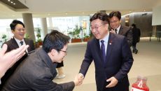 [서울=뉴스핌] 윤호중 행정안전부 장관이 5일 오전 정부세종청사 중앙동 로비에서 출근하는 직원들과 새해 인사 악수하고 있다.- 2026-01-05 14:11