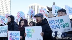 [서울=뉴스핌] 최지환 기자 = 5일 오전 서울 종로구 광화문광장에서 열린 참여연대 2026 신년 기자회견에서 참가자들이 구호- 2026-01-05 11:07