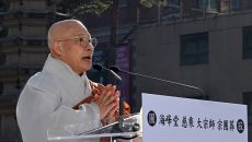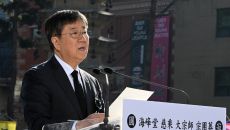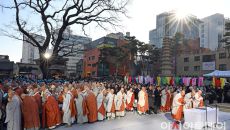 [포토] 조계사 대웅전 앞에 선 자승스님 법구