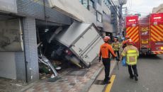 상가 돌진한 탑차...운전자 다치고 건물 통유리 파손