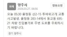 경기도 양주시 율정동에서 교통사고가 발생했다. 27일 양주시는 안전재난문자를 통해 "이날 오전 5시 30분경 율정동의 투바위고- 13시간전