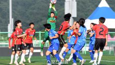 경기 단월중 골키퍼 유도담(왼쪽 셋째)이 23일 경남 합천에서 열린 ‘2025 스포츠케이션 명품도시 합천에서 펼쳐지는 제33회- 2025-06-23 23:23