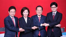 [서울=뉴시스] 조수정 권창회 하지현 우지은 기자 = 국민의힘 나경원·이철우·한동훈·홍준표 대선 경선 후보가 20일 서울 강서- 2025-04-20 16:48