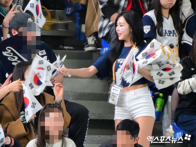 7일 오후 일본 도쿄돔에서 열린 2026 월드베이스볼클래식(WBC) C조 한국과 일본의 경기, 차영현 치어리더가 태극기를 관중들에게 나눠주고 있다. 김한준 기자 kowel@xportsnews.com