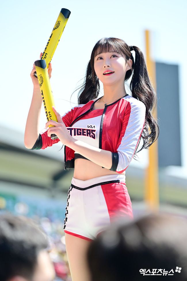 20일 오후 서울 송파구 잠실야구장에서 열린 '2025 신한 SOL Bank KBO리그' KIA 타이거즈와 두산 베어스의 경기, 정가예 치어리더가 열띤 응원을 선보이고 있다. 김한준 기자 kowel@xportsnews.com