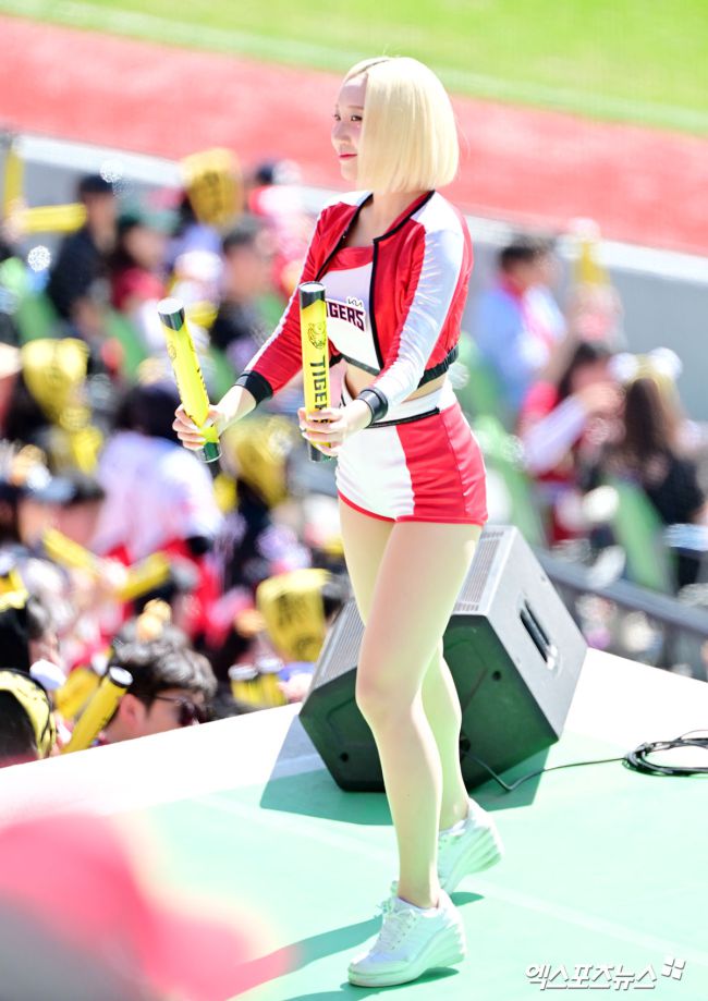 20일 오후 서울 송파구 잠실야구장에서 열린 '2025 신한 SOL Bank KBO리그' KIA 타이거즈와 두산 베어스의 경기, 박성은 치어리더가 열띤 응원을 선보이고 있다. 김한준 기자 kowel@xportsnews.com