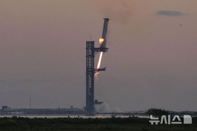 [보카치카=AP/뉴시스] 13일(현지시각) 미국 텍사스주 남부 보카치카 해변의 스타베이스에서 스페이스X 우주선 스타십의 로켓 부스터 '슈퍼헤비'가 발사대 메카질라에 역추진해 돌아오고 있다. 2024.10.14. [서울=뉴시스]윤현성 기자 = 미국의 민간우주기업 스페이스X가 팰컨9, 스타십 등 '재사용 발사체' 기술의 상업화에 성공한 이후 우주 선도국들도 곧