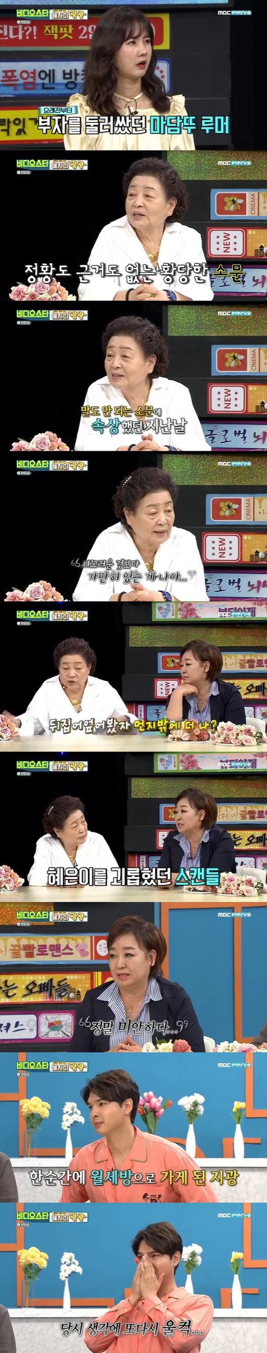 강부자가 자신을 둘러싼 마담뚜 관련 루머를 직접 바로 잡았다. 16일 오후 방송된 MBC every1 '비디오스타'에서는 '200회 레전드 특집! 혜자미 광광(狂光) 특집' 2부로 꾸며졌다. 배우 강부자, 가수 혜은이, 개그우먼 이성미, 그리고 트로트 가수 류지광이 출연했다. 강부자는 과거 후배 이미숙을 주연 배우로 데뷔시킨 일화를 공개하면서 "이미숙이 T