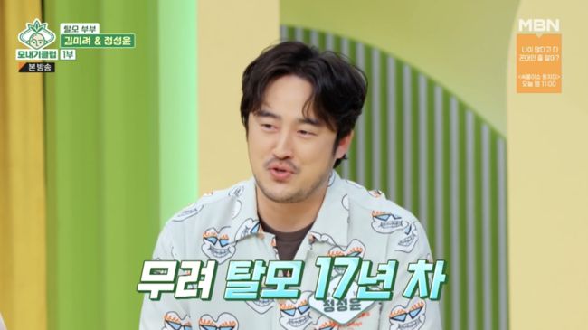 '모내기클럽' 방송화면 '모내기클럽' 코미디언 김미려의 배우자 정성윤이 탈모 부부로 자신들을 소개했다. 1일 방송된 MBN-LG헬로비전 ‘모내기클럽’에는 정성윤, 김미려 부부, 풍자, 김승현, 문수인이 게스트로 출연한 가운데 정성윤이 오랜 탈모 고민을 털어놔 눈길을 끌었다. 이날 정성윤은 "'주유소 습격사건'에서 유지태 배우가 은발을 한 걸 보고 너무 멋있