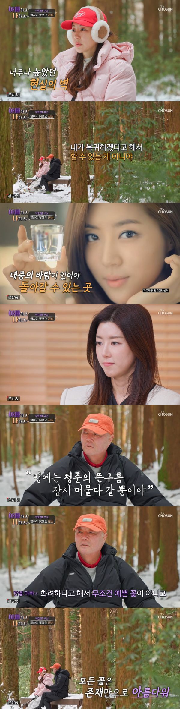 사진=TV조선 박한별이 6년 만에 복귀를 결심한 이유를 밝혔다. 8일 방송된 TV조선 '아빠하고 나하고'에는 박한별과 부친의 일상이 그려졌다. 이날 박한별은 아버지와 함께 제주 오름 산행에 나섰다. 아버지는 박한별에게 조심스럽게 공백기 이야기를 꺼내며 "이제 다시 복귀해서 너 하고 싶은 것도 하고 그랬으면 한다"고 말했다. 박한별은 "나는 방송 활동 복귀는