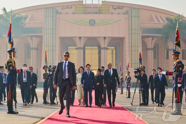 (서울=뉴스1) 이재명 기자 = 이집트 공식 방문 일정을 마친 이재명 대통령과 김혜경 여사가 21일(현지시간) 카이로 국제공항에서 남아프리카공화국 요하네스버그로 출발하기 위해 공군 1호기로 향하고 있다. (대통령실 제공. 재판매 및 DB 금지) 2025.11.23/뉴스1 2expulsion@news1.kr Copyright ⓒ 뉴스1. All rights