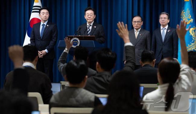 (서울=뉴스1) 이재명 기자 = 이재명 대통령이 3일 서울 용산 대통령실 청사에서 ‘빛의 혁명 1주년, 대통령 대국민 특별성명’ 발표를 마친 후 취재진 질문을 받고 있다. 2025.12.3/뉴스1 2expulsion@news1.kr Copyright ⓒ 뉴스1. All rights reserved. 무단 전재 및 재배포, AI학습 이용 금지.