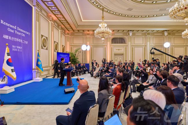 (서울=뉴스1) 이재명 기자 = 이재명 대통령이 3일 청와대 영빈관에서 열린 '새롭게 선 민주주의, 그 1년' 외신 기자회견에서 취재진의 질문을 받고 있다. (대통령실 제공. 재판매 및 DB 금지) 2025.12.3/뉴스1 2expulsion@news1.kr Copyright ⓒ 뉴스1. All rights reserved. 무단 전재 및 재배포, AI학습