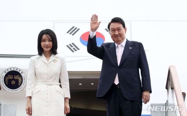 [성남=뉴시스] 홍효식 기자 = 나토(NATO·북대서양조약기구) 정상회의 참석차 스페인 마드리드를 방문하는 윤석열 대통령과 부인 김건희 여사가 27일 경기도 성남 서울공항에서 공군1호기 탑승 전 손을 흔들어 인사하고 있다. 2022.06.27. yesphoto@newsis.com [서울=뉴시스]이지예 기자 = 조 바이든 미국 대통령이 북대서양조약기구(NAT