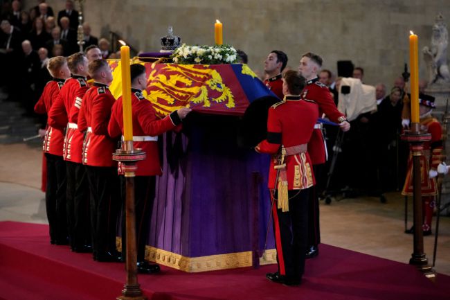 고(故) 엘리자베스 2세 영국 여왕의 관이 14일(현지시간) 영국 런던 웨스트민스터 홀에 안치돼 있다./사진=로이터=연합뉴스 아시아투데이 하만주 워싱턴 특파원 = 영국 정부가 19일(현지시간) 영국 런던 웨스트민스터 사원에서 거행되는 고(故) 엘리자베스 2세 영국 여왕의 장례식에 북한을 초청했다고 로이터통신이 14일(현지시간) 보도했다. 로이터는 영국 외교