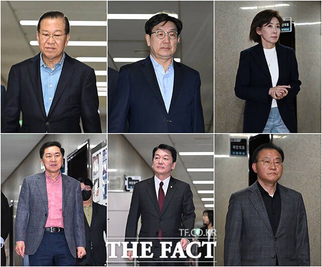 권영세 국민의힘 비상대책위원장과 권성동 원내대표, 나경원 의원, 윤재옥 의원, 안철수 의원, 김기현 의원(왼쪽 위부터 시계방향)이 6일 오후 서울 여의도 국회에서 열린 4선 이상 중진 의원들과의 간담회에 참석하고 있다. /국회=박헌우 기자 권영세 국민의힘 비상대책위원장(오른쪽). 권영세 국민의힘 비상대책위원장과 권성동 원내대표, 나경원 의원, 윤재옥 의원,