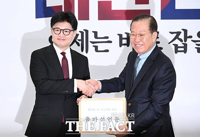 한동훈 전 국민의힘 대표(왼쪽)가 10일 오후 서울 여의도 국회에서 권영세 국민의힘 비상대책위원장에게 출마 선언문을 건네고 있다. /국회=박헌우 기자 한동훈 전 국민의힘 대표(왼쪽)가 10일 오후 서울 여의도 국회에서 권영세 국민의힘 비상대책위원장에게 출마 선언문을 건네고 있다. 한동훈 전 대표는 이날 권영세 비대위원장을 예방해 "직전에 당대표를 떠난 사람