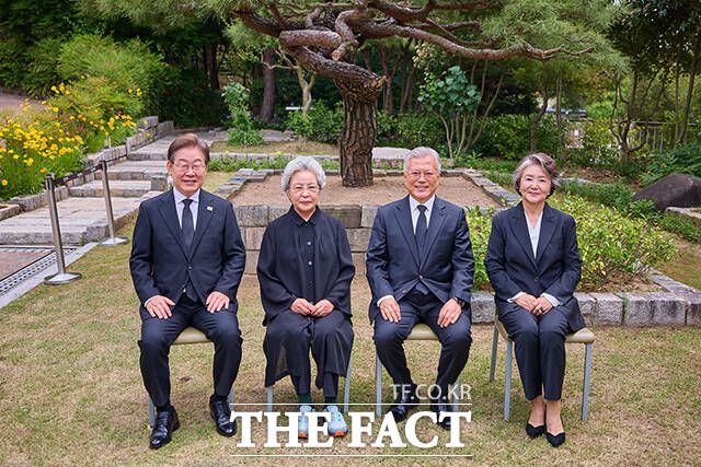 이재명 더불어민주당 대선 후보(왼쪽)가 고 노무현 전 대통령 서거 16주기인 23일 경남 김해시 진영읍 봉하마을을 방문해 권양숙 여사(왼쪽 두번째), 문재인 전 대통령(왼쪽 세번째), 김정숙 여사와 기념 촬영을 하고 있다. /더불어민주당 오찬 즐기는 문재인 전 대통령과 권양숙 여사, 이재명 더불어민주당 대선 후보. /더불어민주당 이재명 더불어민주당 대선 후