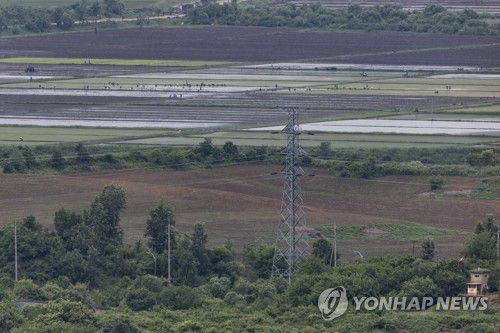모내기하는 북한 주민들 (파주=연합뉴스) 임병식 기자 = 30일 경기도 파주시 서부전선 비무장지대(DMZ) 도라전망대에서 바라본 파주와 개성공단을 잇는 송전탑 너머로 북한 주민들이 모내기하는 모습이 보인다. 2023.5.30 andphotodo@yna.co.kr (서울=연합뉴스) 김지헌 기자 = 북한에서 외부의 인도적 지원이 필요한 인구가 1천만 명 이상이