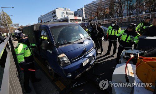 (서울=연합뉴스) 서명곤 기자 = 정부와 국민의힘이 연내 개 식용 종식을 위한 특별법 제정을 추진하기로 한 가운데 30일 오후 서울 용산 대통령실 앞에서 대한육견협회 등이 연 집회에서 참가자들이 개를 실은 트럭을 경찰이 견인하려하자 항의하고 있다. 2023.11.30 seephoto@yna.co.kr ▶제보는 카카오톡 okjebo ▶연합뉴스 앱 지금 바로