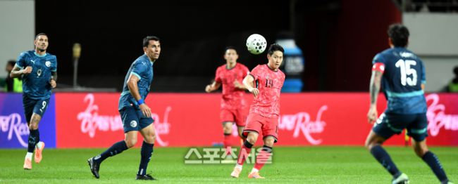 이강인이 14일 서울월드컵경기장에서 열린 남자 축구 국가대표 평가전 파라과이와 경기에서 오현규에 패스를 하고 있다. 2025. 10. 14.최승섭기자 thunder@sportsseoul.com 이강인(파리생제르맹)은 ‘조커’로도 확실한 존재감을 보였다. 이강인은 14일 서울월드컵경기장에서 열린 파라과이와 10월 A매치 평가전에서 후반 시작과 함께 교체돼 4