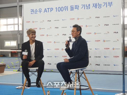 권순우(왼쪽)가 21일 서울시 구로구 귀뚜라미 크린 테니스 코트에서 인터뷰를 하고 있다. 사진 | 박준범기자 “올시즌은 10점 만점에 10점이에요.” 세계랭킹 88위 권순우(22·당진시청·CJ제일제당후원)는 21일 서울시 구로구 귀뚜라미 크린 테니스 코트에서 열린 ‘ATP 100위 돌파 기념 재능기부’ 행사에 참석했다. 권순우는 올시즌 최고의 한해를 보냈다