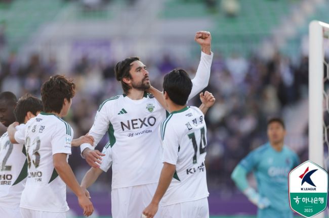 전북 콤파뇨(가운데). 사진 | 한국프로축구연맹 “스트라이커가 득점하는 건 당연한 일이다.” 거스 포옛 감독이 이끄는 전북은 30일 안양종합운동장에서 열린 ‘하나은행 K리그1 2025’ 6라운드 FC안양과 원정 경기에서 1-0으로 승리했다. 5경기 만에 승점 3을 추가한 전북(승점 8)은 2승(2무2패)째를 챙겼다. 콤파뇨는 올해 K리그에 입성했다. 그는