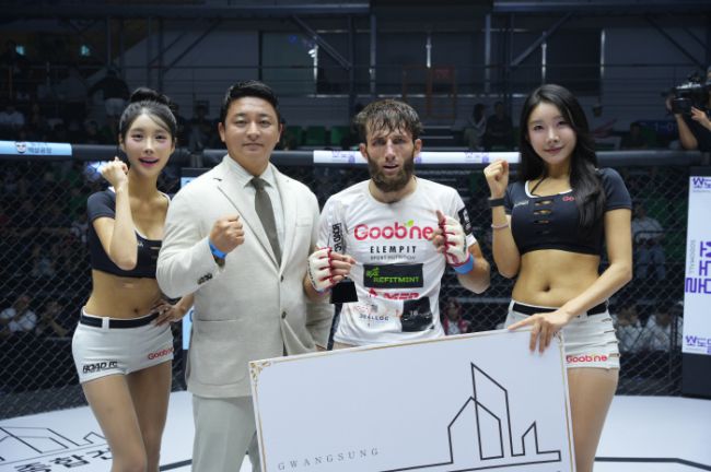 아키우노 종합건설 박준혁 회장이 27일 안산 상록수체육관에서 열린 굽네 ROAD FC 074 플라이급 매치에서 승리한 라술 오마로프에게 트로피를 시상한 뒤 기념촬영을 하고 있다. 사진제공=로드FC