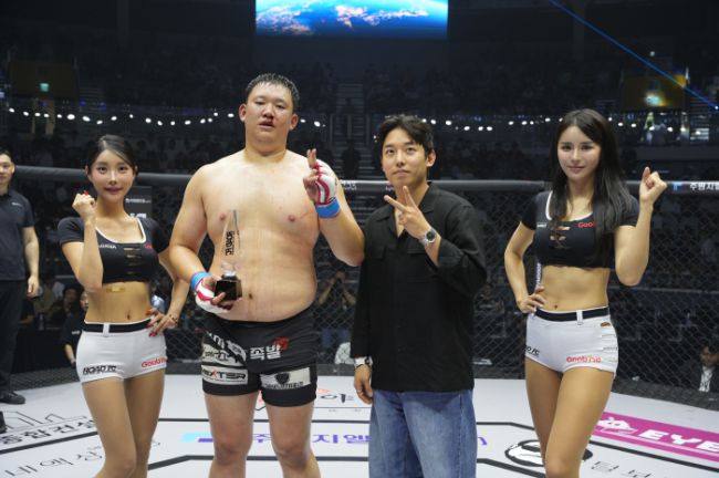 상록회관 임동혁 대표가 28일 서울 장충체육관에서 열린 ROAD FC 073 무제한급 매치에서 승리한 김기환에게 트로피를 시상한 뒤 기념촬영을 하고 있다. 사진제공=로드FC