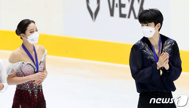 2022 베이징 동계올림픽에 출전하는 차준환(오른쪽)과 유영. /뉴스1 © News1 박지혜 기자 (서울=뉴스1) 김도용 기자 = 국제빙상경기연맹(ISU) 피겨스케이팅 4대륙 선수권대회에 출전하는 한국 피겨스케이팅 국가대표 선수들이 에스토니아행 비행기에 올랐다. 남자 싱글의 차준환(고려대), 경재석(경희대), 여자 싱글의 유영, 김예림(이상 수리고), 이해