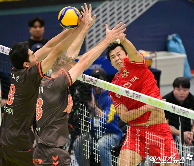 5일 오후 경기도 수원실내체육관에서 열린 '진에어 2025-2026 V-리그' 한국전력과 OK저축은행의 경기, 한국전력 서재덕이 공격을 시도하고 있다. 김한준 기자 kowel@xportsnews.com