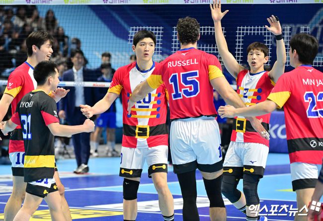 19일 오후 인천 계양체육관에서 열린 '진에어 2025-2026 V-리그' 대한항공과 한국전력의 경기, 대한항공 선수들이 득점 후 기뻐하고 있다. 김한준 기자 kowel@xportsnews.com