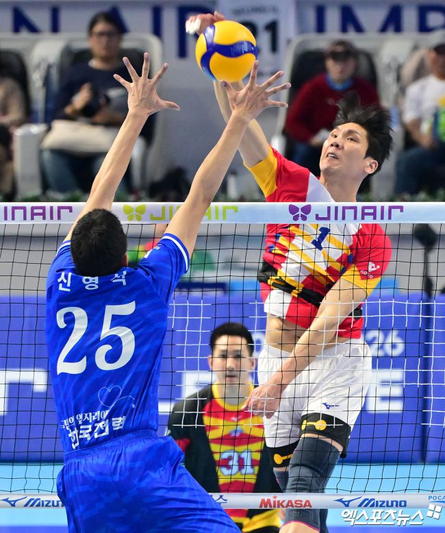 19일 오후 인천 계양체육관에서 열린 '진에어 2025-2026 V-리그' 대한항공과 한국전력의 경기, 대한항공 김규민이 공격을 시도하고 있다. 김한준 기자 kowel@xportsnews.com