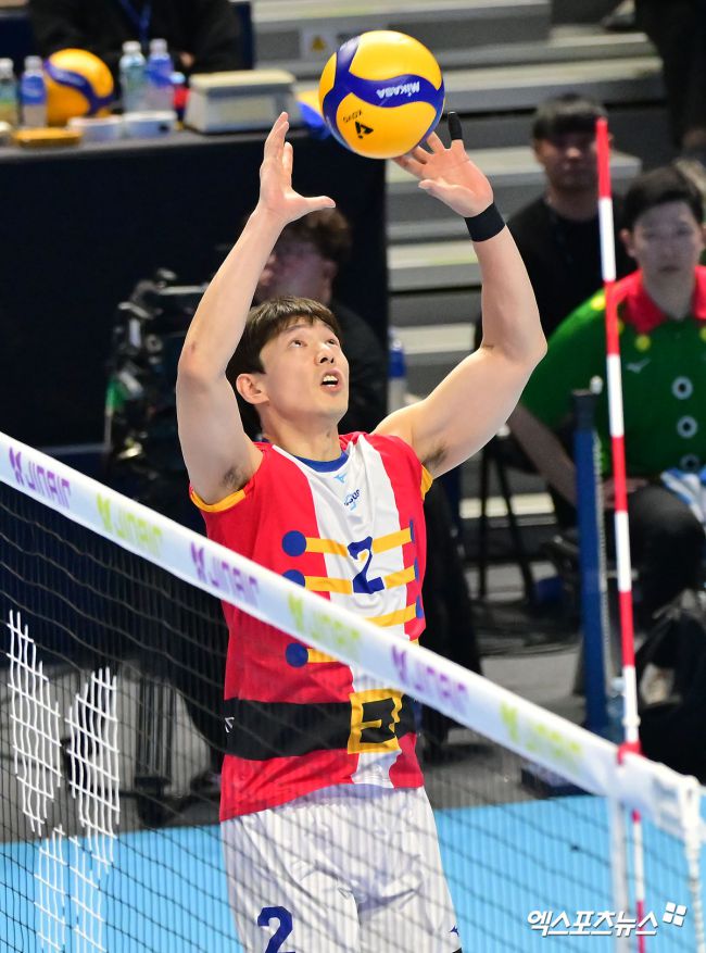 19일 오후 인천 계양체육관에서 열린 '진에어 2025-2026 V-리그' 대한항공과 한국전력의 경기, 대한항공 한선수가 토스를 하고 있다. 김한준 기자 kowel@xportsnews.com