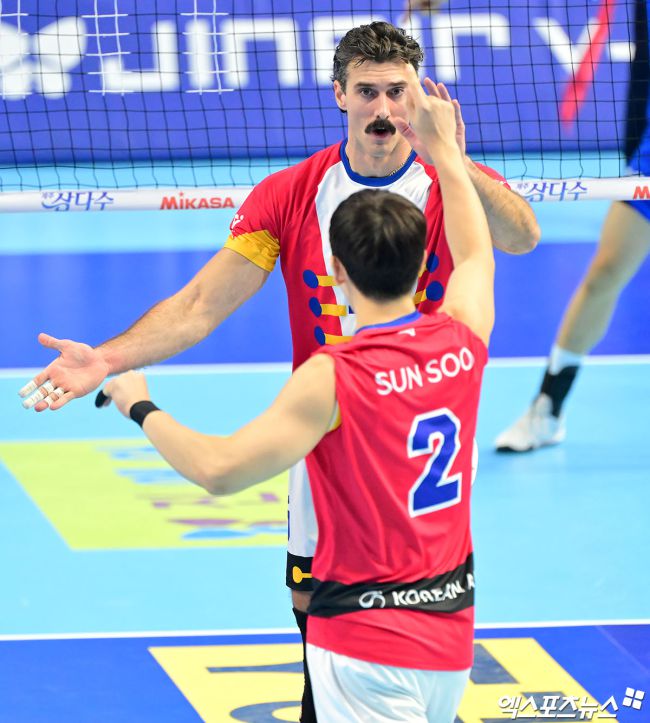 19일 오후 인천 계양체육관에서 열린 '진에어 2025-2026 V-리그' 대한항공과 한국전력의 경기, 대한항공 러셀이 득점 후 한선수와 하이파이브를 하고 있다. 김한준 기자 kowel@xportsnews.com