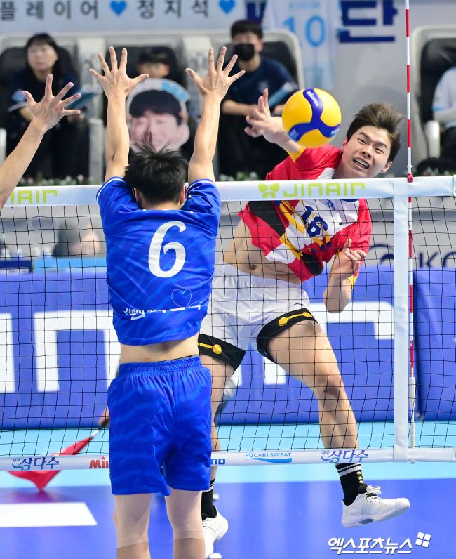 19일 오후 인천 계양체육관에서 열린 '진에어 2025-2026 V-리그' 대한항공과 한국전력의 경기, 대한항공 정한용이 공격을 시도하고 있다. 김한준 기자 kowel@xportsnews.com