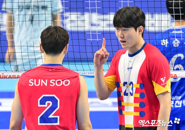 19일 오후 인천 계양체육관에서 열린 '진에어 2025-2026 V-리그' 대한항공과 한국전력의 경기, 대한항공 김민재가 한선수와 대화를 나누고 있다. 김한준 기자 kowel@xportsnews.com