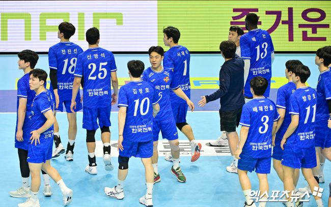 19일 오후 인천 계양체육관에서 열린 '진에어 2025-2026 V-리그' 대한항공과 한국전력의 경기, 대한항공이 한국전력에 세트스코어 3:0(25-22, 25-13, 26-24)으로 승리했다. 경기종료 후 한국전력 선수들이 아쉬워하고 있다. 김한준 기자 kowel@xportsnews.com